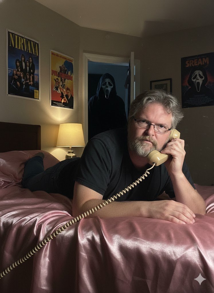 It’s not perfect; the telephone cord doesn’t cast a shadow, there’s this weird highlight on Ghostface’s lip that comes out of nowhere, And why are there four people on the Nirvana poster? Dave, Krist, Kurt. That’s three members. Three! (And are they wearing tuxes? What madness is this?)